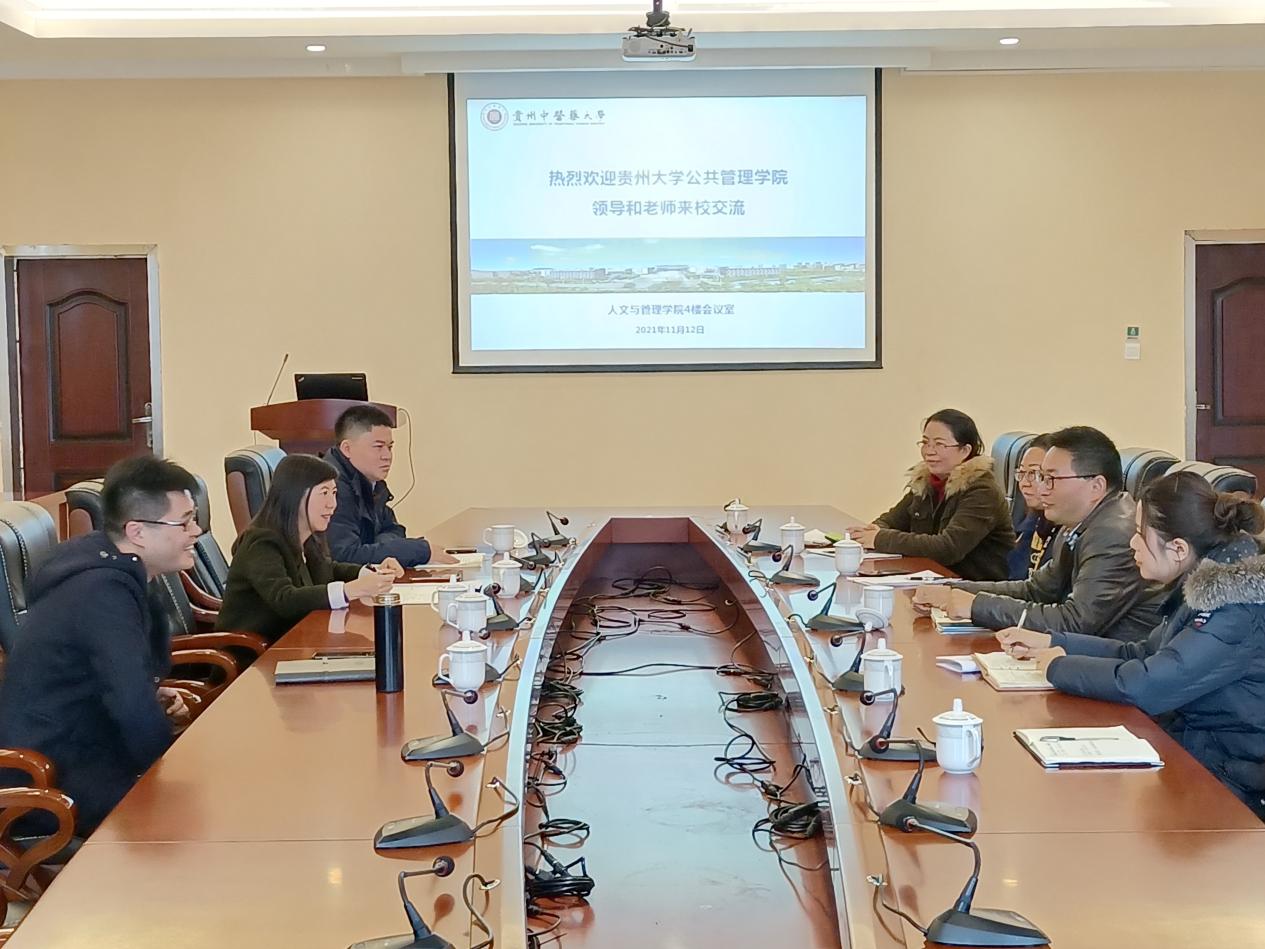 为迎接国家学位办2021年公共管理硕士专业学位授权点质量专项巡查,规范MPA研究生教育教学过程,提高MPA研究生培养质量,2021年11月12日,我院副院长、MPA教育中心副主任王志凌带领MPA教育中心全体工作人员赴贵州中医药大学人文与管理学院交流学习。贵州中医药大学人文与管理学院党委书记陈瑶、党委副书记、院长吴小勇、副院长刘维蓉、MPA教育中心教学秘书李悦鸣以及专任教师代表参加了交流会。会议在贵州中医药大学笃学楼4楼会议室召开,由刘维蓉副院长主持。