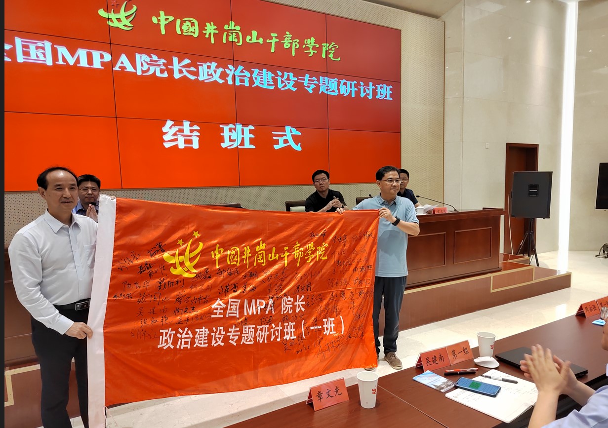结班式于7月5日下午举行。中国井冈山干部学院副院长柯华、人力资源部主任许光洪,全国MPA教指委秘书长杨开峰等出席结班式。结班式由教指委委员、北京师范大学政府管理学院院长章文光同志主持,教指委委员、华东师范大学公共管理学院院长孟溦同志代表全体学员作学习小结发言。她指出本次培训收获满满,概括起来有三大收获,即收获了知识和理论,提高了政治能力和提高了践行初心使命的自觉性。同时,她也代表全体学员表示,本次培训之后,会继续把学习贯彻习近平新时代中国特色社会主义思想作为首要任务和中心内容。