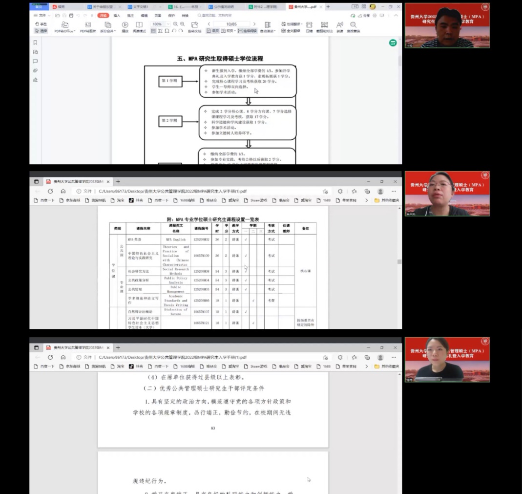 入学教育环节,王松老师为同学们梳理了MPA研究生的各项培养环节及注意事项,特别强调硕士论文撰写的相关要求; 吴声凤老师为大家介绍了MPA研究生培养方案,包括专业方向、课程设置、出勤考核等同学们目前最关心的问题,并强调大家一定要提高对课程的重视程度;钟祎老师为大家讲解了研究生学位申请积分条件以及贵州大学MPA研究生荣誉称号评定办法,提醒大家一定要提早完成学位积分,以免耽误授位时间。至此,2022级MPA研究生开学典礼暨入学教育圆满结束。溪山如黛,常沐春风,百廿贵大,弦歌不辍,风华正茂。待到“疫”去花香时,我们再相聚。