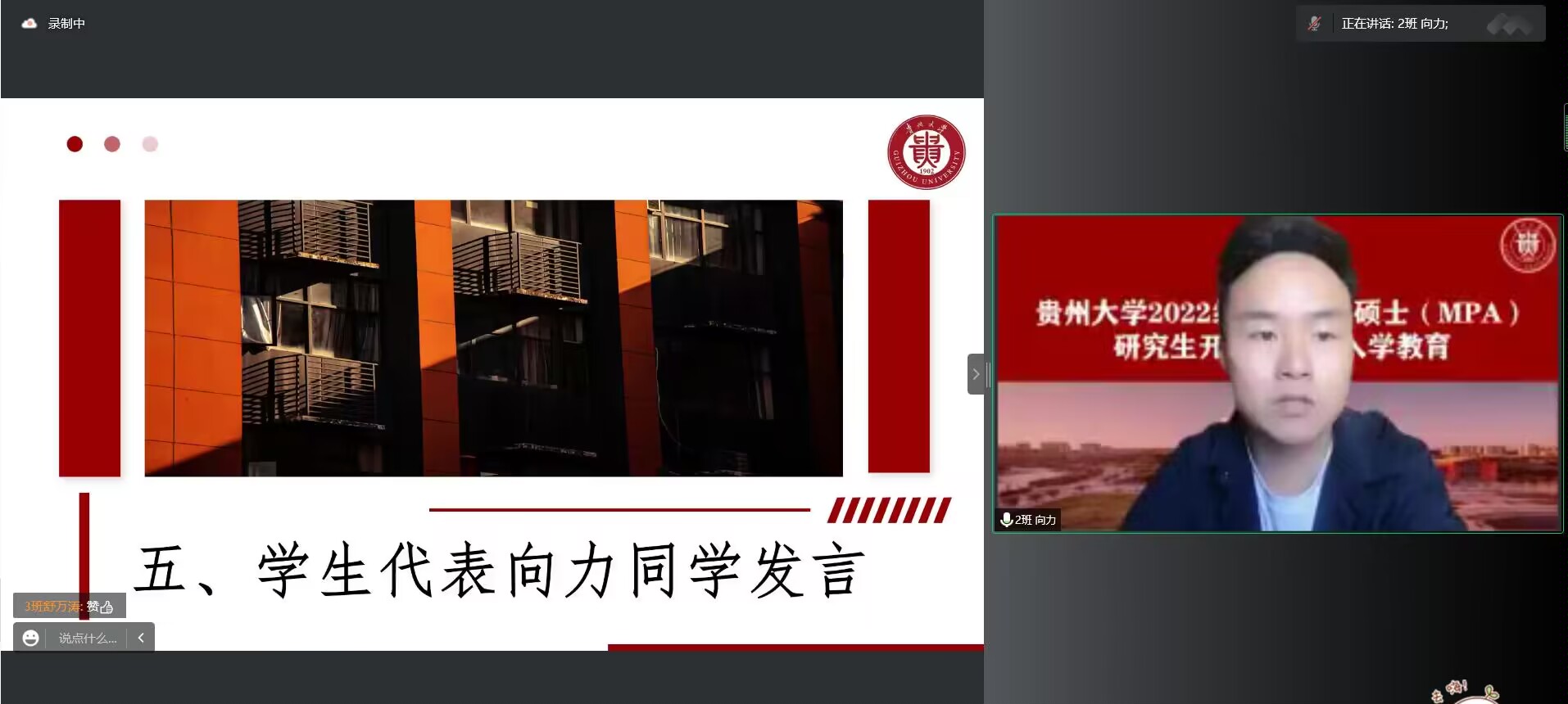 紧接着,由优秀导师代表任敏教授发言。面对镜头中几位身穿防护服的新同学,她表示,突如其来的奥密克戎让贵阳的防疫形势第一次如此紧张,静态管控让我们暂时无法和年轻而热忱的新同学面对面,但在线上空间的相聚依然让她为贵州大学公共管理共同体的发展壮大感到激动和欣喜,并向奋战在一线的同学们表达了敬意。她详细介绍了公共管理精神的内涵以及如何运用和发扬,并从“重视课程学习”、“养成阅读习惯”、“积极参加各类竞赛”、“紧跟培养环节”4个要点为同学们指明了学习方向,同时强调了“自律”对MPA研究生的重要性。她希望同学们能坚持服务国家的初心和使命,将自身的发展融入时代的发展,尽情体验知识获取的乐趣,能力锻炼的欣喜,素质提升的愉悦,人格塑造的美好。