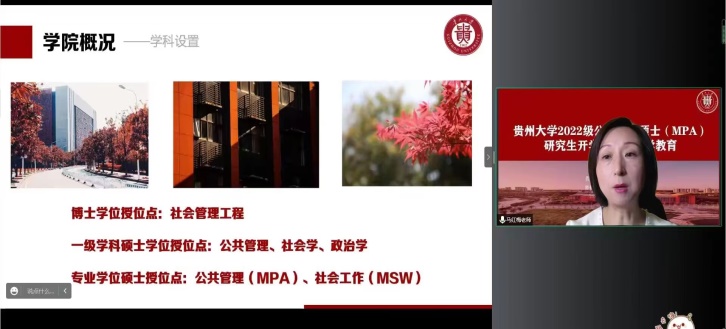 秋风送爽,稻穗金黄。2022年9月7日上午9: 30,为严格落实疫情防控要求,贵州大学2022级公共管理硕士(MPA)新生开学典礼暨入学教育在线上隆重举行。公共管理学院院长、MPA教育中心主任马红梅教授、优秀导师代表任敏教授、MPA教育中心办公室主任王松老师、MPA教学秘书吴声凤老师、MPA辅导员钟祎老师及全体2022级MPA研究生共计200余人出席参加。