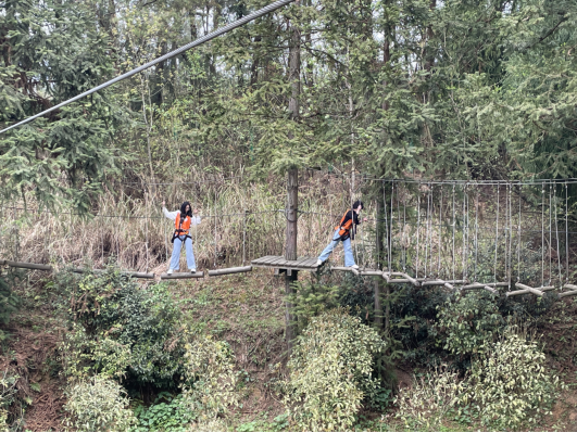 第三个项目是“空中栈道”:同学们需穿上安全装备,经过各种空中栈道的障碍,到达终点。有的同学因恐高而退缩,经过教官和同学们暖心的引导和鼓励,最终还是鼓起勇气,迈出坚定的步伐,顺利走完全程。