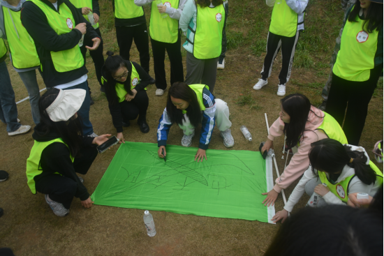 到达目的地后,教官首先组织同学们进行破冰活动:熟悉组员、选出队长,设计小组队名、队歌、队旗、队形和口号。二十分钟内,各组成员发扬团队精神,集思广益,“也不全”队、“女生说得都”队、“胜利军队”、“金刚兔”队等一个个有着响亮队名的队伍相继登场,并为大家演唱了《孤勇者》、《小兔子乖乖》等令人耳熟能详的歌曲。各组的口号和队旗别出心裁,队形也在团队间的默契配合下完成展示。