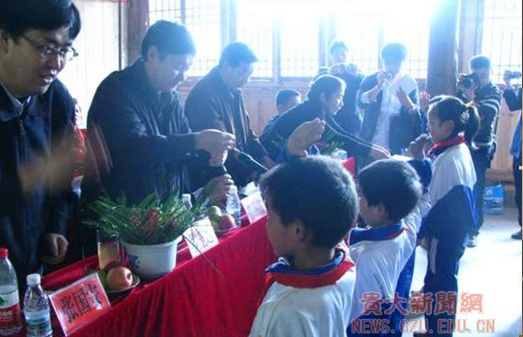 22日下午,杜书记一行抵达石阡县,23日一早,就前往国荣乡楼上古寨举行了贵州大学马列部在石阡县开展“四帮四促”活动暨捐赠助学仪式。石阡县副县长徐再高、贵州大学马列部党总支书记杜国辉、主任罗玉达29人和国荣乡党政领导、教育行政负责人、中小学负责人等出席了仪式。仪式由石阡县副县长徐再高主持,国荣乡楼上村小学100余学生参加了仪式。