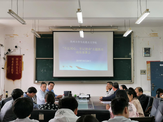 9月24日下午,贵州大学马克思主义学院在会议室召开了“不忘初心,牢记使命”主题教育的动员部署会。学校主题教育第三巡回指导小组副组长毛元华、成员龙明杰到会指导。马克思主义学院党委书记杨仁厚、学院两任前党委书记杜国辉和罗玉达、副院长郭红军、副院长李传兵、副院长卢正涛等党政班子成员、党员教职工及学生党支部成员到会。会议由副院长郭红军主持。