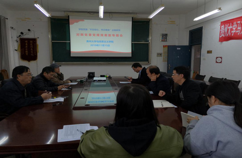 为落实贵州大学主题教育实施方案中关于检视问题部分的相关文件要求,2019年11月15日上午,贵州大学马克思主义学院党委在学院会议室召开了“不忘初心,牢记使命”主题教育——对照党章党规找差距专题会。学校主题教育第三巡回指导组成员龙明杰老师到会指导。马克思主义学院党委书记杨仁厚、院长张国安、副院长李传兵、副院长郭红军、副院长卢正涛、研究生党支部委员参加会议。会议由学院党委书记杨仁厚主持。