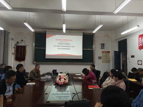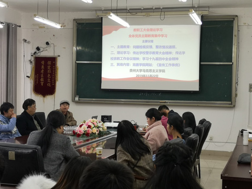 其次,在理论学习部分,杨仁厚书记依次向大家传达了学校警示教育大会精神;学校宗教工作会议精神;十九届四中全会精神。第一,杨仁厚书记向大家传达学校警示教育大会精神,这是主题教育当中的一个重要环节。警示教育内容丰富,杨仁厚书记首先向大家传达贵州省纪委驻贵州大学特派专员宣布的校内外的一些违法违纪的案例。其次是贵州大学党委副书记令狐彩陶同志通报的第二批校内巡查所发现的问题。最后,杨仁厚书记还对老师提出建议,希望所有教师提高警惕,做好榜样。第二,杨仁厚书记向大家传达学校宗教工作会议精神,中央对宗教工作高度重视,杨书记表示我们要坚决贯彻国家的宗教原则和方针,加强执行国家宗教政策,贯彻二十字方针“保护合法、制止非法、抵御渗透、遏制极端、打击犯罪”,要求干部党员、政治理论教师认真学习国务院宗教工作条例以及习近平总书记对宗教工作的论述,积极引导宗教与社会主义事业相适应。第三,学习十九届四中全会精神。这是《中共贵州大学委员会关于认真学习宣传贯彻党的十九届四中全会精神的通知》要求的。杨书记表示,十九届四中全会包括习近平做的工作报告、通过的文件以及习近平对通过文件的说明,所涉及的内容全面丰富。杨书记挑选报告当中的一点——坚持马克思主义在意识形态领域指导地位的根本制度,带领大家学习,主要有全面贯彻落实习近平新时代中国特色社会主义思想、深入实施马克思主义理论研究和建设工程、加强和改进学校思想政治教育、落实意识形态工作责任制。这些内容是十九届四中全会精神所通过的诸多内容之一,老师同学应该结合自己的研究专长、所承担的课程,认真学习、研究、宣传。