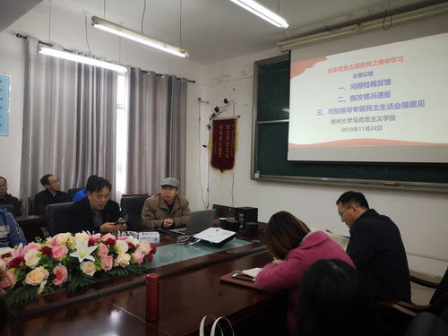 首先,杨仁厚书记表示根据贵州大学主题教育实施方案的规定,其中一个环节是就问题检视要向普通党员和教师反馈,整改情况向大家通报。在“问题检视”方面,马克思主义学院通过不同的途径和形式,收集了老师和同学的大量问题。其中一次是学院根据学校要求,进行了表格式的问卷了解,比如你最希望学院帮你解决的问题或难题是什么、你认为学院班子存在的问题是什么、你认为学院领导存在的主要问题是什么。针对这些问题,学院领导都进行了详细的梳理。但是,在提出“问题”的过程中,也存在一些问题,如提出的一些问题含糊不清,一些问题不尽合理(例如要求少开会)、有些问题明显是是学校职能部门范围的事情(学院领导也在积极向学校反馈)。凡是学院范围内的问题,学院领导班子要义不容辞地落实、解决。“问题”除了来源于老师同学的反馈以外,学院还通过观察、调研、学校对学院的建设意见等方面举行搜集。第二,在整改情况通报方面,杨书记提到根据主题教育规定,能当时改的就立改立行。如,马克思主义学院研究生反映没有专门的自习室,这一问题由郭红军院长负责整改落实;一部分研究生反映三年期间报销一次书费似乎不太合理,针对这一问题,学院领导也在努力想办法落实;还有部分同学反映研究生党支部建设存在的问题,特别是在发展党员这一环节,杨仁厚书记加大了对学生发展党员的指导和监督力度。杨仁厚书记还说到,要切实加强对学院全体党员的管理和指导,把党支部建设好、发展好,为此还对学院党委成员所属党支部的安排举行了调整。第三,根据学校主题教育方案的规定,在主题教育最后一个环节有民主生活会,在学院民主生活会召开之前,要向老师同学征集意见,老师同学应该积极地提出意见,目的是把党支部和马克思主义学院建设得更好。