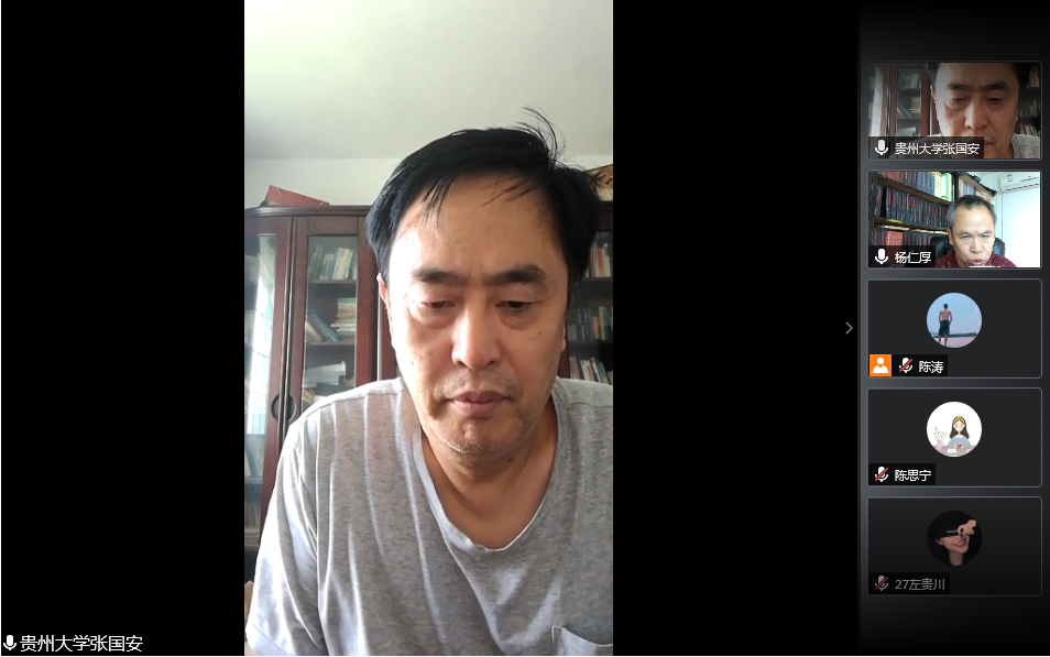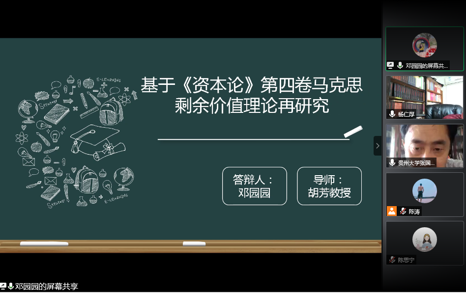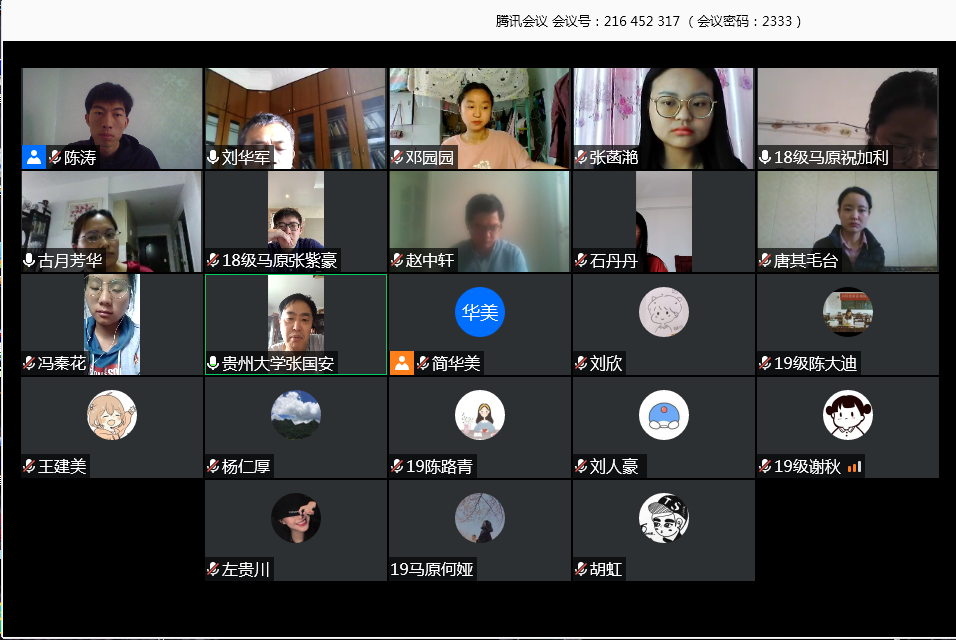 根据疫情防控工作需要,马克思主义学院2018级马克思主义基本原理专业于2020年5月14日上午9:00在线上举行了毕业论文开题答辩会。马克思主义学院张国安教授、杨仁厚教授、胡芳教授、韦滢教授、刘华军副教授五位老师以及2018级、2019级马克思主义基本原理专业全体研究生参加了此次会议。