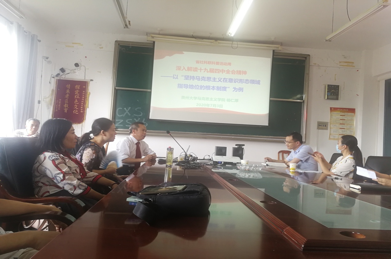 为深入学习宣传贯彻党的十九届四中全会精神和省委十二届六中全会精神,7月3日,贵州大学马克思主义学院在逸夫楼六楼会议室举行了“2020年贵州省社会科学宣传普及周暨理论学习大会——学习十九届全会精神”。学院领导、全体党员、全体教职工、在校学生党员参加了本次会议。会议由马克思主义学院党委书记杨仁厚主持。本次理论学习的内容主要有:第一、深入解读十九届四中全会精神。第二、学习贯彻十九届四中全会精神。第三,学习贯彻十九届四中全会精神临时发言。