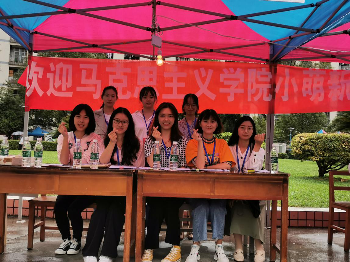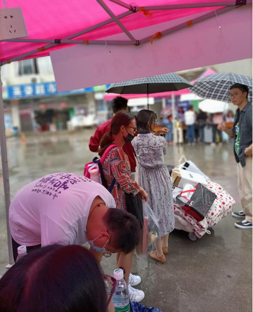 马克思主义学院新生报到点设置于北校区中山园广场。清晨空气微甜,小雨纷纷,微凉沁肤,迎新工作人员便到达新生报处,精心布置好现场,准备好报到所需物质和工作材料。不久,2020级马克思主义学院的萌新们便在红的、黄的、黑的圆圆伞朵的庇护下陆续到来,学院工作人员一一有序向他们收取报道材料,帮忙搬运行李,跟车迎送到寝,指点一卡通、水卡办理地点,与初来的小萌新一同挥洒汗水,分享喜悦。学院的学长学姐们用自己的耐心、热忱和实干,化解了各位2020级小萌新们旅途的疲劳、初见的拘怩以及雨湿路滑所带来的不愉快,他们脸上洋溢的笑容以及声声真诚谢语便是最好的证明。