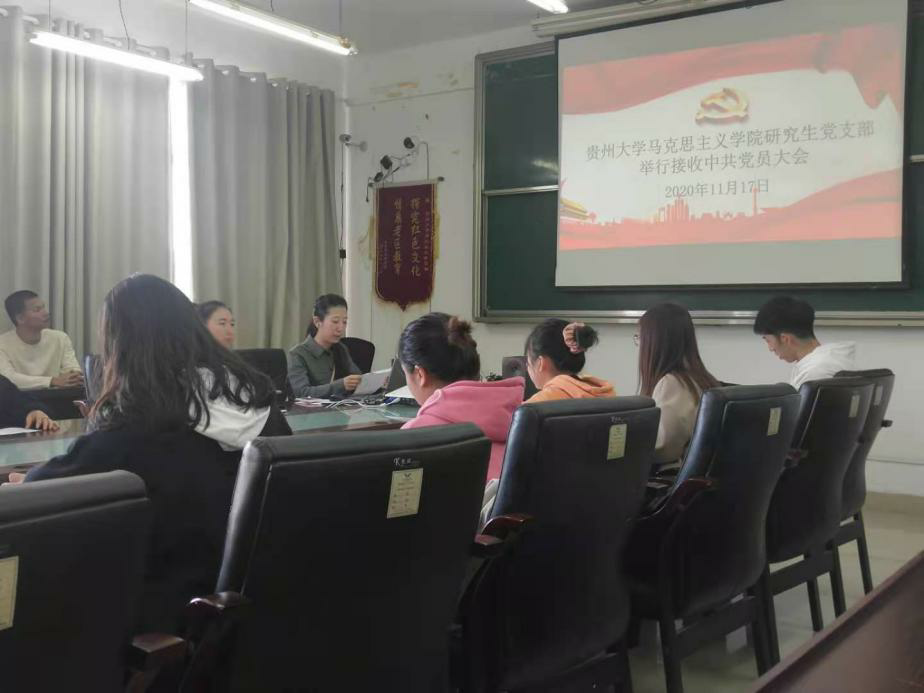 2020年11月11日下午,贵州大学马克思主义学院研究生党支部在学院会议室顺利召开预备党员——洪迪同志的转正大会。参加本次会议的人员主要有焦敬超同志、马呐同志、陈涛同志、杨雪同志以及陈欣同志等在内的30余名党员同志。研究生党支部书记焦敬超主持会议。