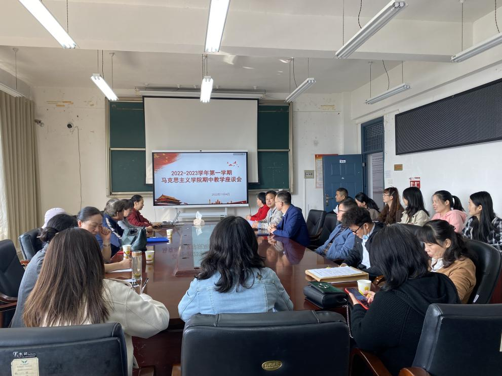 2022年11月4日上午,马克思主义学院在逸夫楼616会议室通过线上线下混合的方式召开期中教学座谈会。郭红军副院长(主持工作)、崔东明副院长、校督导罗运璇老师、院督导组成员、各教研室主任、部分教师代表以及院教学科全体成员参加会议。