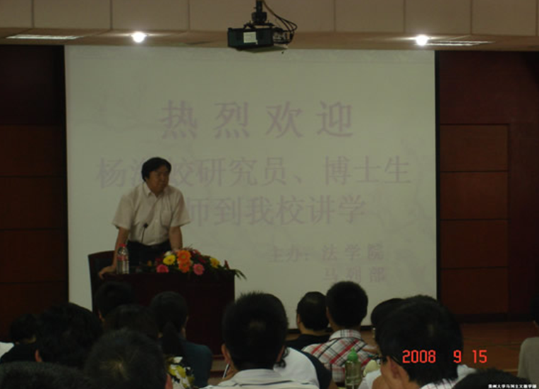 2008年9月15日下午,在我校模拟法庭,中国社会科学院政治学所研究员、博士生导师、中国政治学会秘书长、《政治学研究》副主编杨海蛟教授为法学院、马列部大学生和研究生做了一场题为“大学生为什么要学习政治学”的精彩报告。