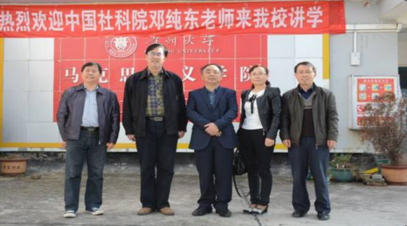 2016年11月18日,中国社会科学院马克思主义研究院党委书记、院长邓纯东教授在我校新校区西楼203DT教室为全校师生作了“坚持马克思主义指导”的专题讲座。贵州大学马克思主义学院院长张国安教授主持讲座。邓纯东教授曾任中共中央政策研究室信息研究局副局长,中共广西桂林市委副书记,广西新闻出版局、版权局党组书记、局长。2013年6月起,任中国社会科学院马克思主义研究院党委书记、院长。长期从事马克思主义理论研究。