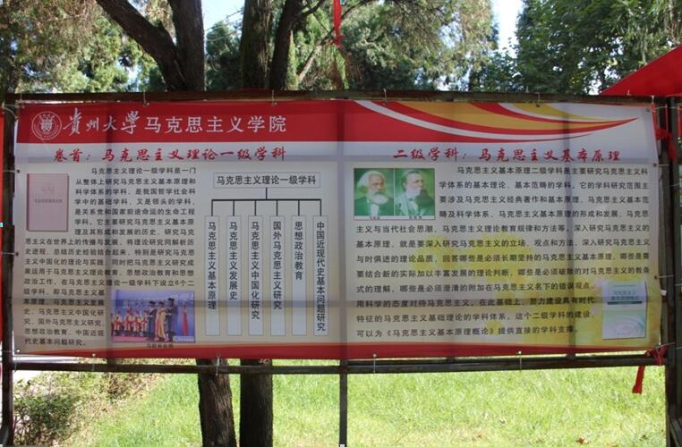 2013年9月,我院应学校号召,协同我校哲学社会科学研究院在校园内举办2013年贵州省社科普及周系列活动之文科宣传活动。活动的主题:加强马列学科建设,弘扬主流意识形态。策划:马克思主义学院院长张国安教授、副院长李传兵教授;顾问:哲学社会科学研究院副院长杨仁厚教授、马克思主义学院书记罗玉达教授。