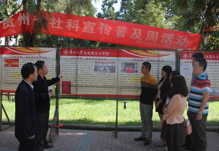 师生们在社科普及周相互交流并探讨社会科学学术问题。此次活动扩大了学生对马克思主义知识的了解,加深了学生对马克思主义学科的求知欲,更增添了学生对社会科学学科的兴趣,在师生之间得到肯定及赞扬,为2013年贵州省社科普及周系列活动—贵州大学马克思主义学院社科普及周宣传活动画上圆满句号。