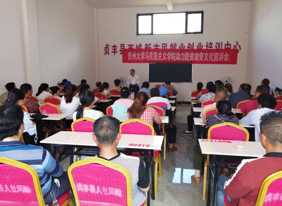 当日下午两点,社区党组织安排了两个宣讲场地。一个是西城社区创业就业培训基地教室,能够容纳听众60多人。一个是西城社区党员活动室,可以容纳听众40多人。社区工作人员对于听众做了较好的组织和动员,也悬挂了醒目的大横幅“贵州大学马克思主义学院助力脱贫攻坚文化宣讲会”。