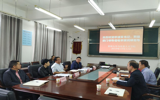 为了做好“不忘初心、牢记使命”主题教育调查研究阶段的工作,2019年10月12日,贵州大学党委书记李建军率领校党委组织部部长李昕昌、人事处处长张洁副处长江河、教务处处长陈祥盛,到马克思主义学院开展题为“贵州大学思想政治课程建设”的领题座谈调研活动。马克思主义学院参加此次调研座谈会的有学院党委书记杨仁厚、院长张国安、副院长郭红军、副院长李传兵、副院长卢正涛,以及部分教研室主任、党支部书记。