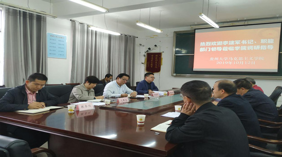 为了做好“不忘初心、牢记使命”主题教育调查研究阶段的工作,2019年10月12日,贵州大学党委书记李建军率领校党委组织部部长李昕昌、人事处处长张洁副处长江河、教务处处长陈祥盛,到马克思主义学院开展题为“贵州大学思想政治课程建设”的领题座谈调研活动。马克思主义学院参加此次调研座谈会的有学院党委书记杨仁厚、院长张国安、副院长郭红军、副院长李传兵、副院长卢正涛,以及部分教研室主任、党支部书记。
