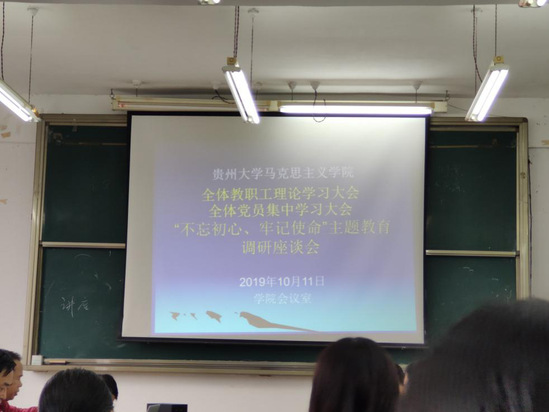 为进一步提升教师和研究生党员政治素养,2019年10月11号下午三点,贵州大学马克思主义学院党委举行全体教职工理论学习大会·全体党员集中学习大会·“不忘初心,牢记使命”主题教育调研座谈会。学院党委书记杨仁厚、院长张国安、副院长李传兵、副院长卢正涛,参加学习。会议由马克思主义学院党委书记杨仁厚教授主持。