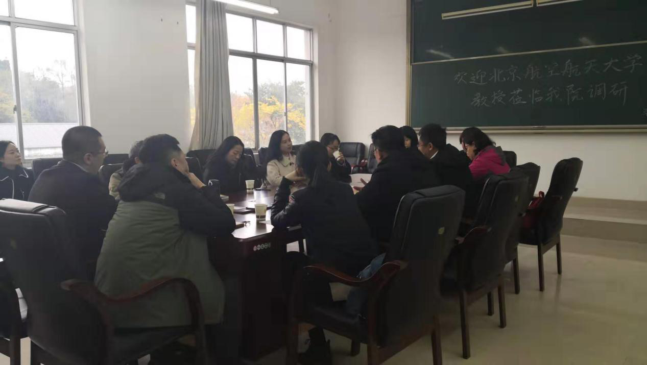 2019年11月22日下午3点,北京航空航天大学马克思主义学院院长助理张树焕、办公室主任陈萌、教务处主任常方圆一行8人来我院调研。纲要教研室主任刘华军、支部书记袁珠萍,原理教研室主任范方红、支部书记潘海涛以及部分骨干教师共7人参与了调研座谈会。