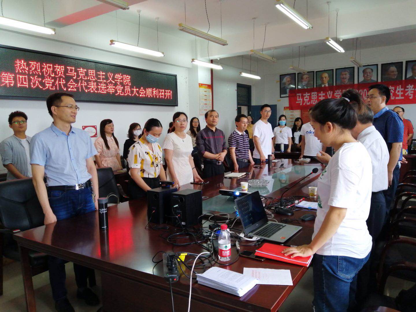 全院教职工及学生党员应到66人,实到54人,因故不能参加会议的主要是受新冠疫情影响尚未返校的学生党员,出席本次会议的党员人数达到法定要求,符合相关选举办法规定。另有10位预备党员参加了会议。会议由马克思主义学院党委书记杨仁厚主持。会议在全体党员肃立并高声奏唱雄壮的《国歌》声中开始。