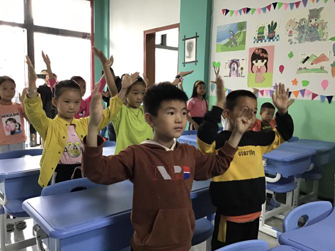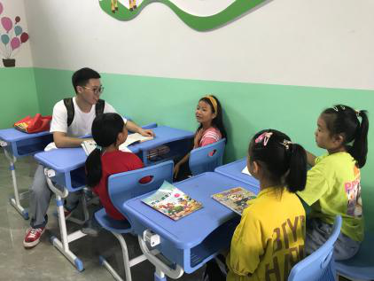 手势舞结束以后,同行研究生同学就到场中小学学生各自挑选书籍进行阅读指导活动。数位中小学学生围绕着一位研究生同学进行热烈交流,研究生同学们结合自身经验就阅读方法、学习技巧、未来展望等多方面对在场小朋友进行交流指导。现场气氛活跃,孩子们的脸上洋溢着笑容,眼中充满了光芒。“四点半学校”为西城社区为区内适龄中小学学生课后免费教学、作业辅导学校,虽只有两间小小的教室,却装载着社区大大小小数百人的梦想,更是城乡之间、地区之间缩小教育差距征程上的有力之举。
