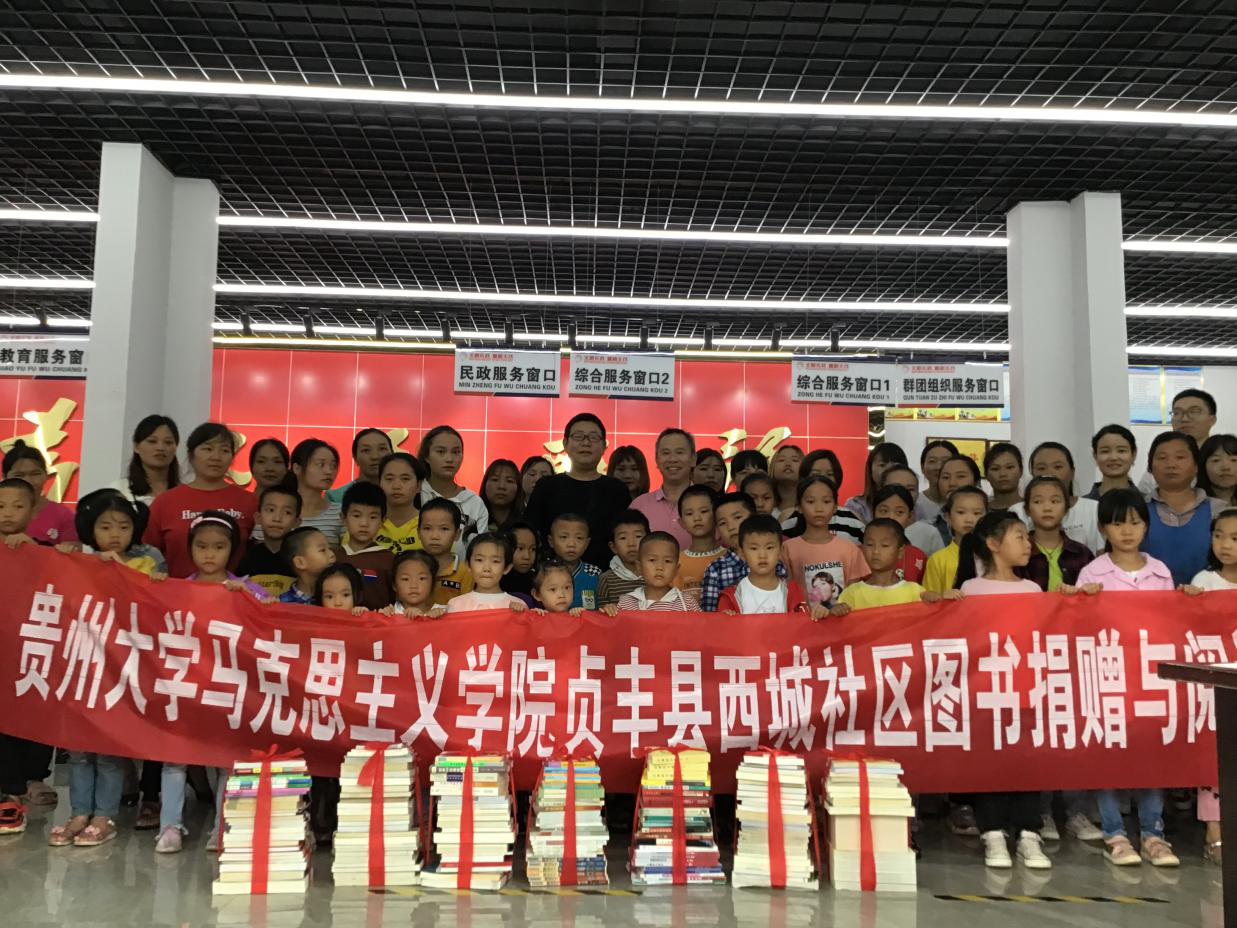 2020年8月21日,贵州大学马克思主义学院党委书记杨仁厚带领本院研究生一行七人前往黔西南州贞丰县丰茂街道西城社区进行图书捐赠与阅读指导活动。西城社区系贞丰县扶贫搬迁安置点,为我院在贵州省脱贫攻坚事业中对点帮扶单位,本次活动意在加强和巩固西城社区文化建设。