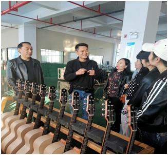 (调研组参观娜塔莎吉他装配车间,了解吉他的选材、工艺和生产线等)