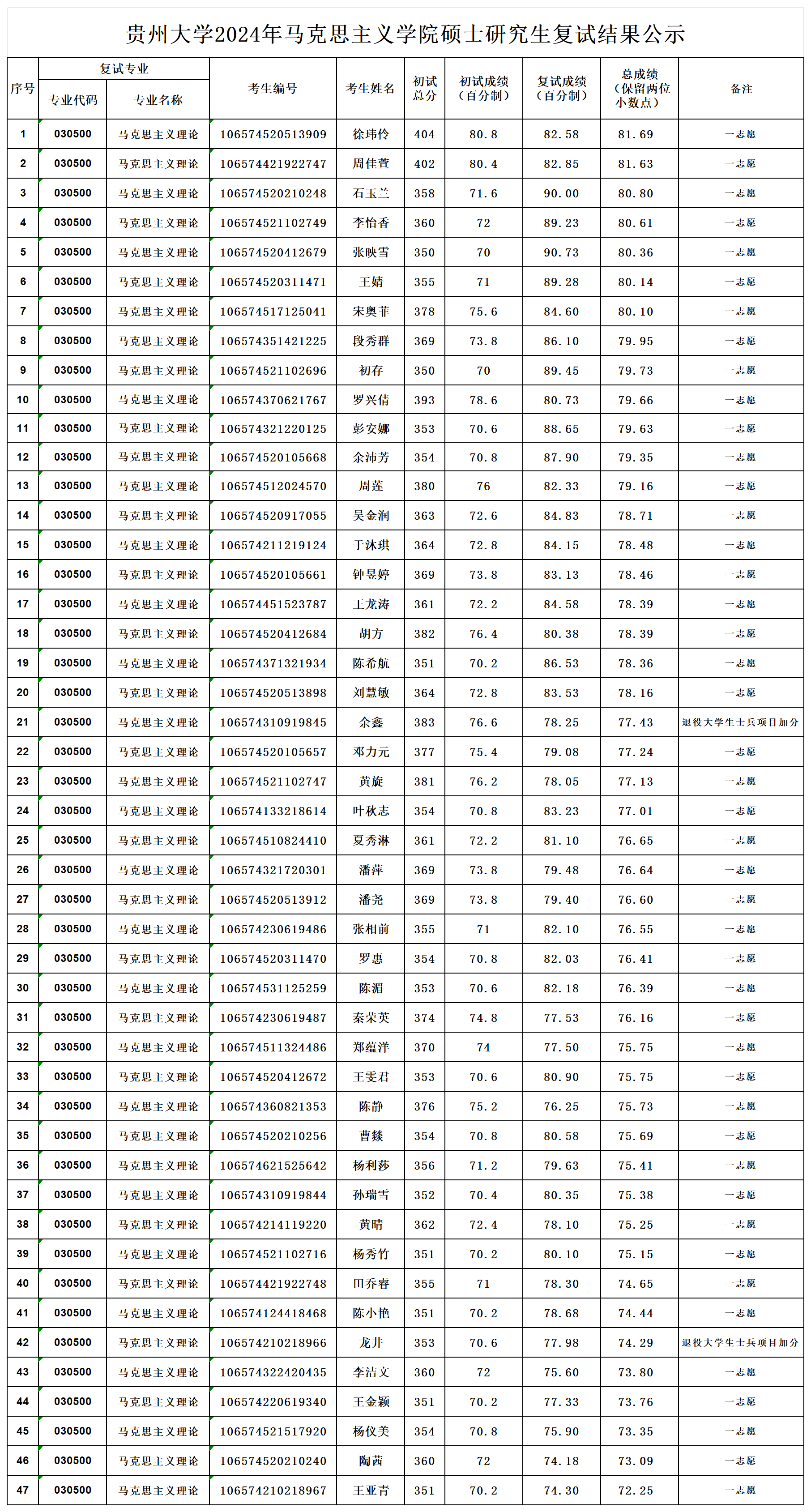 贵州大学2024年马克思主义学院硕士研究生复试结果公示