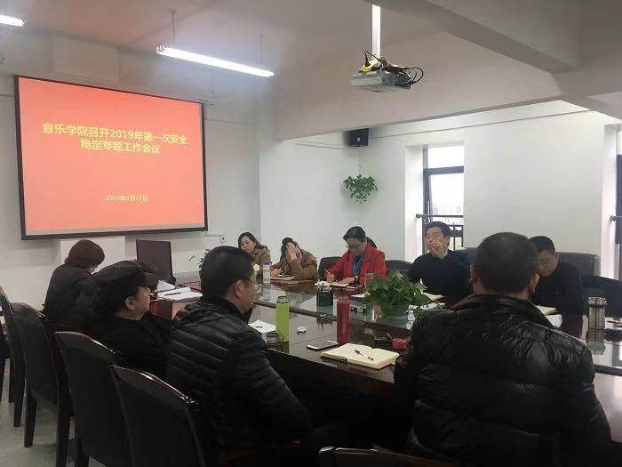 2019年3月13日上午,音乐学院在学院802会议室召开“音乐学院2019年第一次安全稳定工作会议”。出席会议的有学院党委书记范斌同志,副书记张波同志,学院各系部书记及各科室负责人。会议由学院党委书记范斌同志主持。