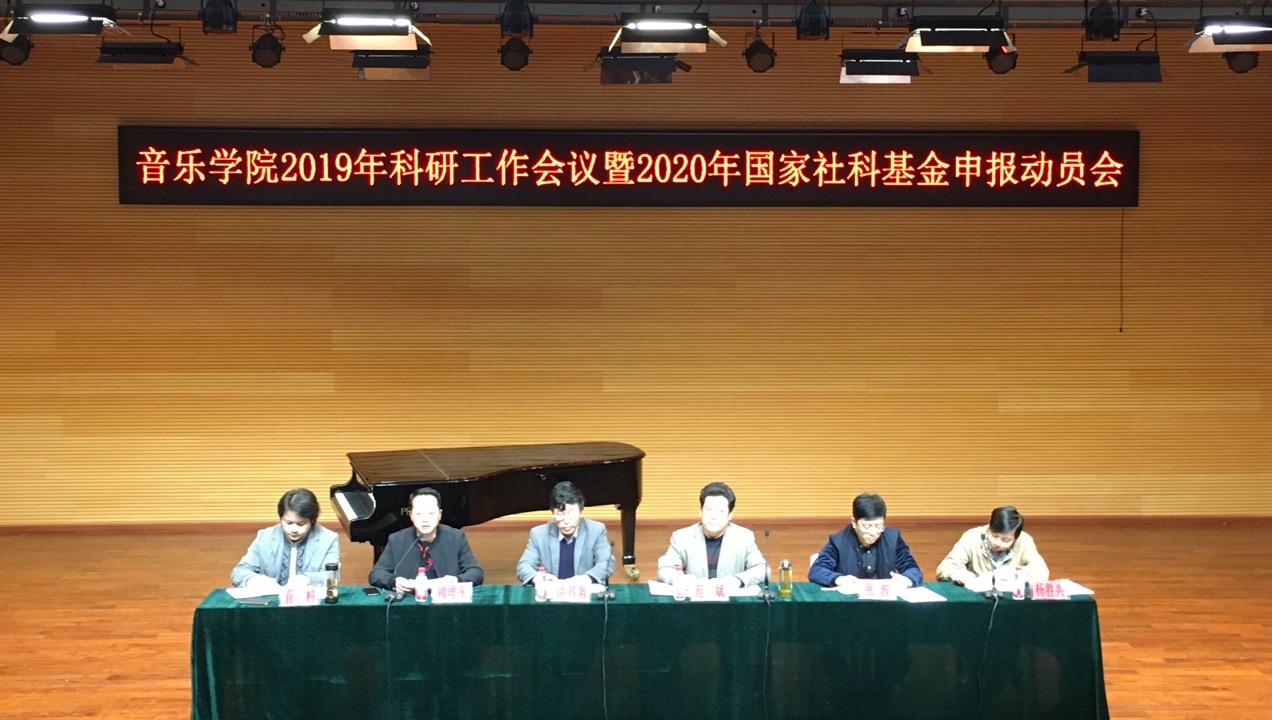 2019年11月14日下午2:30,音乐学院在学院小音乐厅召“音乐学院2019年科研工作会议暨2020年国家社科基金申报动员会”。贵州大学哲学社会科学研究院洪名勇院长、学院党政领导班子成员、各教学系(部)主任、学院教师以及院科研与学科建设办公室负责人参加了动员会。