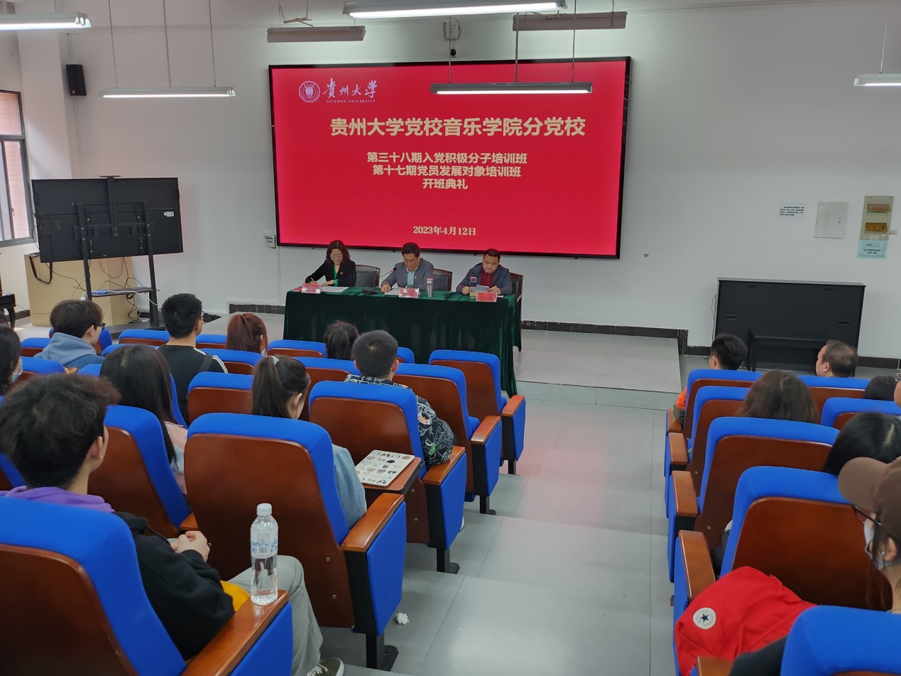 2023年4月12日中午13:00,贵州大学音乐学院在学院106多媒体教室举行了“音乐学院分党校第三十八期学生入党积极分子培训班暨第十七期党员发展对象培训班开班典礼。音乐学院党委书记、音乐学院分党校校长范斌同志、党委副书记马超同志以及全体入党积极分子和党员发展对象150余人参加了开班典礼,开班典礼由音乐学院党委委员、组织员同时也是本期培训班班主任高琛同志主持。