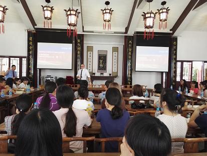 会谈后,Tim Steele副校长在文化书院勉学堂,为我校外国语学院、管理学院及经济学院等学院的学生开展讲座,就中央兰开夏大学办学情况及留学项目做了介绍。
