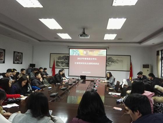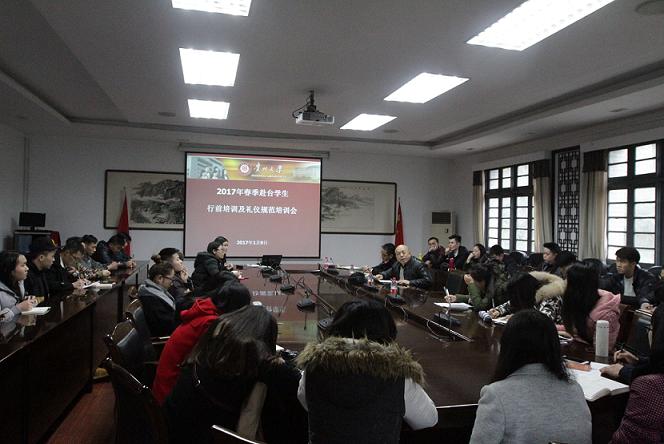 根据贵州大学与台湾各高校签订的合作交流协议,我校2016年下半年陆续启动2017年春季赴台交流学习项目。选拔推荐优秀学生赴台交流学习。为更好地指导和帮助学生在台的学习及生活,我校于2017年1月9日下午在行政楼会议室召开“2017年春季赴台学生行前培训及礼仪规范培训会”。培训会由国际交流与合作处谢明英副处长主持,贵州大学2017年春季赴台学生参加了培训会。