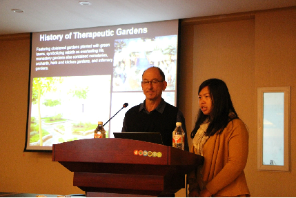 讲座会场座无虚席,丹尼奥教授从古典园林中康复功能讲起,回顾了康复花园的发展历程,引出现代康复花的概念以及其对人的生理、心理以及行为待方面的特殊功效,尤其是在医院、疗养院等对病人的身体康复、临终关怀等方面的无可替代的积极作用。然而详细讲解了康复花园设计的前期调查、设计要点等重要内容,最后以多个其亲自设计建造的康复花园进行了案例分析。中国已步入老龄化阶段,康复花园已在发达地区开始受到关注并进行探索性实践,今后将会是风景园林发展的一个重要方向。