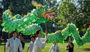 接下来,丰富多彩的节目表演开始了。首先出场的是汪太伟老师领衔美国、中国内地和台湾学生表演的舞龙。铿锵有力的锣鼓节奏和热烈欢快的舞龙,激发了整个活动现场的热闹氛围。美国学生和中国学生合作默契,整个舞龙表演灵动飘逸,激情澎湃。