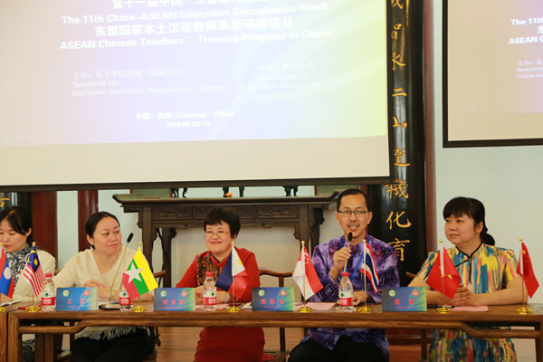 “东盟本土汉语教师研修项目”由孔子学院/国家汉办设立,资助孔子学院兼职本土汉语教师和外国大中小学教师来华进修。此次为期一周(6月13日-19日)的“东盟本土汉语教师研修项目”作为“第十一届中国-东盟教育交流周”的子活动之一,由国际教育学院承办,课程以体验中国传统文化并结合贵州民俗、民风实地考察相结合。