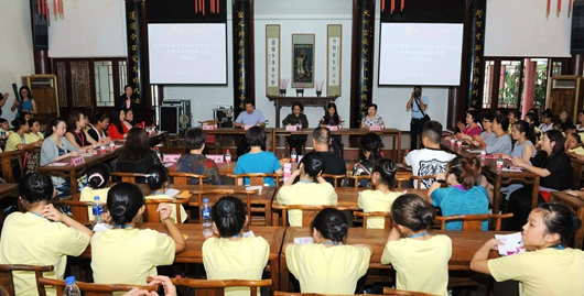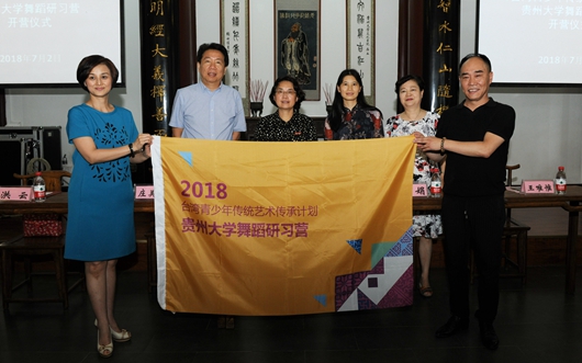 省文化厅外联处处长王娟宣布2018台湾青少年传统艺术传承计划贵州大学舞蹈研习营正式开营。我校音乐学院院长王唯惟向舞蹈研习营代表授旗。