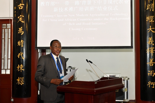 坦桑尼亚水源研究院院长Shija Thomas Kazumba作为学员代表发言。他代表一行学员向中国政府,向贵州大学表示了感谢。他讲到,农业新技术讲座对于发展中国家的扶贫非常有意义,中国先进的农业技术与非洲的农业条件和农业大环境非常适应,他呼吁同行学员将在中国所学的先进农业技术带回非洲,根据非洲当地的具体情况运用于实践,做到不虚此行,造福非洲人民。