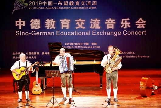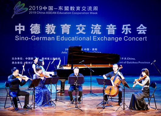 贵大新闻网讯7月23日下午,2019中国-东盟教育交流周中德教育交流音乐会在我校音乐学院实验剧场举行。省政协副主席陈坚,中国-东盟教育交流周组委会秘书处执行秘书长刘宝利,省教育国际交流协会会长周宝英,省教育厅党组成员、省教育工会主席王慧,校党委书记李建军、校党委副书记骆长江、副校长张覃出席音乐会。