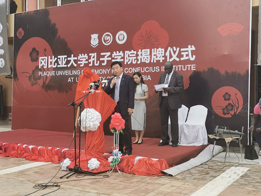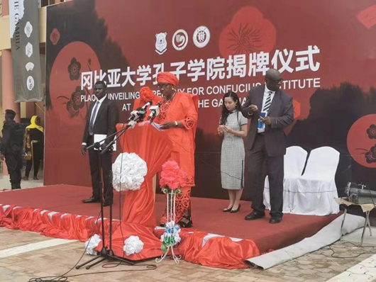 伊莎图·图雷在仪式上致辞。她说,近年来中冈关系保持快速稳定发展,两国在各领域的务实合作全面展开,取得了一系列成果。她指出,冈比亚大学孔子学院的建立,将加强中冈两国在语言、文化方面的交流,对促进两国进一步合作具有重要意义。