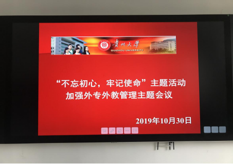 为做好贵州大学2019年“不忘初心,牢记使命”主题活动,2019年10月30日我处牵头召开“不忘初心,牢记使命”主题活动----加强外专外教管理主题会议。教师工作处、学生处、矿业学院、经济学院、外语学院、烟草学院、大数据发展研究院、美术学院、数学与统计学院、农学院相关领导及本单位外教协调老师参加会议。