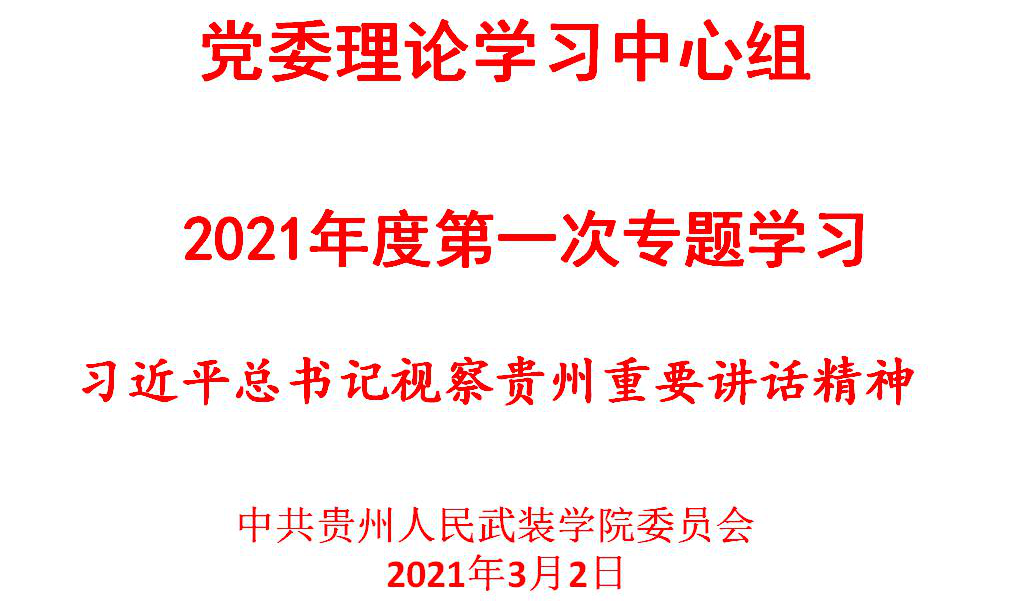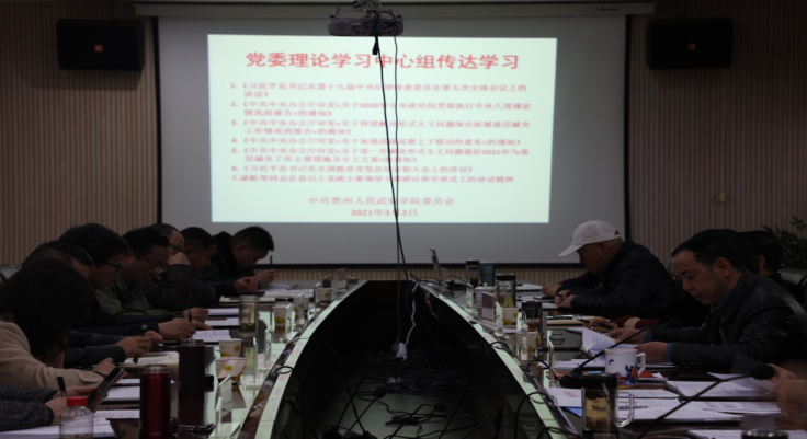 3月2日下午,学院党委理论学习中心组召开2021年度第一次专题会议,学习贯彻习近平总书记视察贵州重要讲话精神,研究部署我院贯彻落实工作。党委中心组全体成员参加学习,党委书记冯建主持会议并讲话。