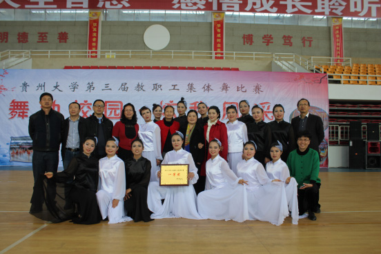 (贵大新闻网讯 体育学院 王成兰 报道︳摄影 龙金贵)为了推进全民健身运动,活跃校园教职工文化生活,促进校园文化建设。3月25日,贵州大学工会于北校区体育馆组织举办了以“舞动校园·炫我风采”为主题的教职工集体舞比赛活动。参赛对象为各学院分工会代表队,共有队伍26支,项目有民族舞、现代舞、健身舞、健美操、爵士舞、交谊舞等。校党委书记陈坚等领导出席典礼,校党委副书记、校工会主席杨未为获奖单位颁奖。中午1点半,活动正式开始。在主持人的介绍中,各个代表队带着自己的舞蹈依次登场。《青春舞曲》点燃了属于贵大教师的那份青春激情;《祝福祖国》表现了对伟大的祖国母亲的爱;《藏族风情》展现出遥远雪域上不一样的美;以及《水墨韵》展示了水墨古韵之美等。不同风格的舞蹈给观众带来了一场美妙的视觉盛宴!体育学院粟显婷感叹:“比赛真精彩,没想到我们老师不仅上得了讲台更上得了舞台!这次比赛让我认识了课堂外的老师,感觉十分亲切”。经过一番激动人心的表演,主持人宣布最终比赛成绩。体育学院以《水墨韵》夺得此次比赛一等奖,全场爆发出热烈的掌声和呼唤声,比赛在热烈的气氛中落下帷幕。