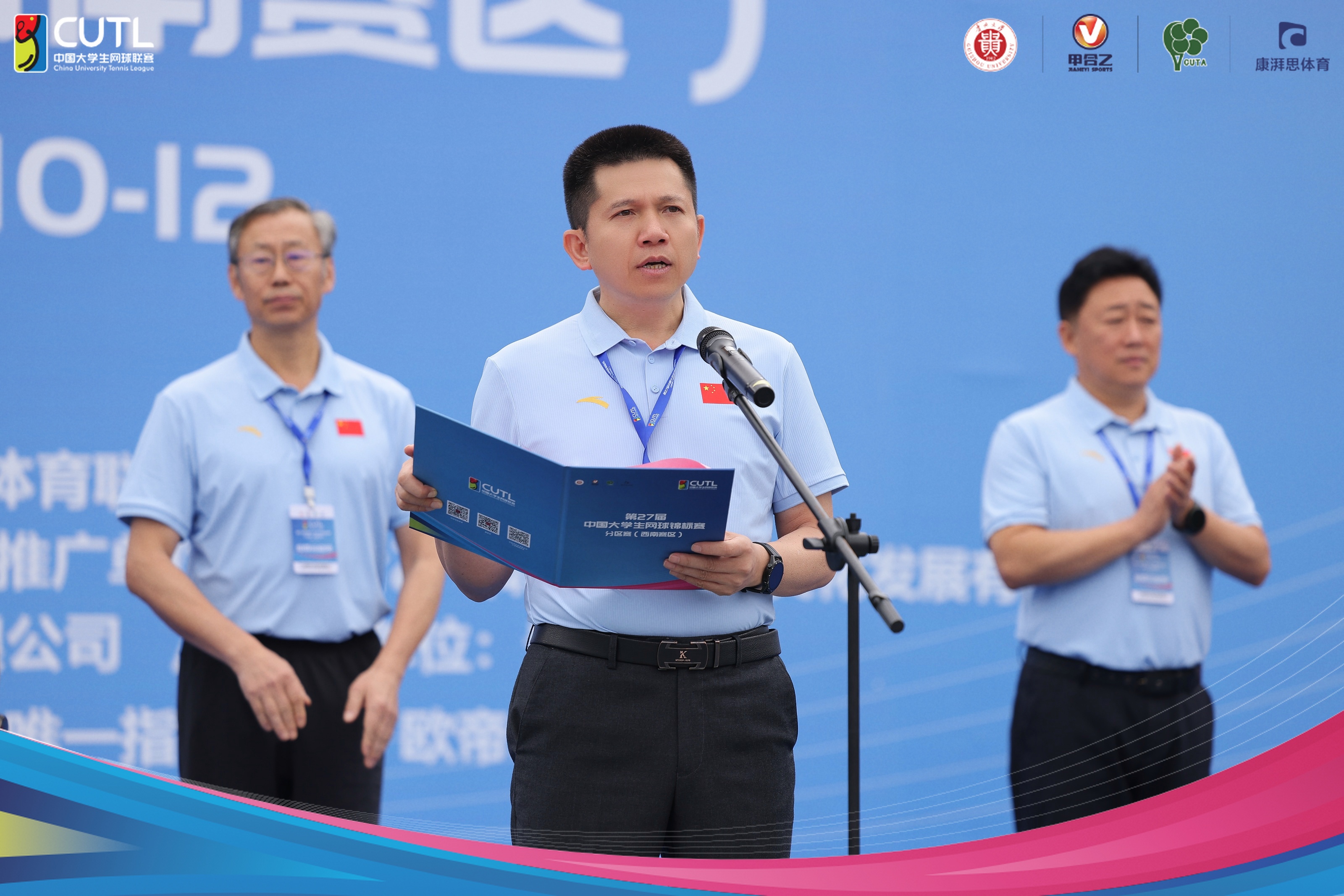 中国学生体育联合会大学网球分会安春元主席,云南师范大学牛治亮副校长,贵州大学陈祥盛副校长,中国学生体育联合会及其大学网球分会相关负责人、裁判员、工作人员、志愿者们,同来自广西、云南和贵州省的27支高校参赛队的领队、教练员、运动员共400余人一道参加开幕式。开幕式由贵州大学体育学院院长博士生导师王华倬教授主持。