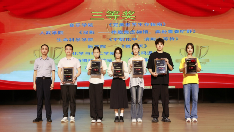 音乐学院《完美世界生存指南》、人武学院《双影—挣脱焦虑枷锁,奔赴青春矿业》、生命科学学院《手机化中,请耐心等待》、医学院《第14天》、化学与化工学院《代码温度》、动物科学学院《完美裂痕》、法学院《时光自白》获得三等奖。