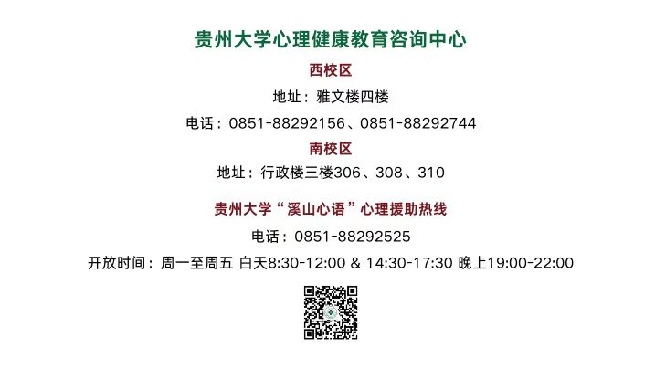 贵州大学“溪山心语”心理援助热线:0851-88292525(周一至周五上午8:30-12:00下午2:30-5:30晚上7:00-10:00)