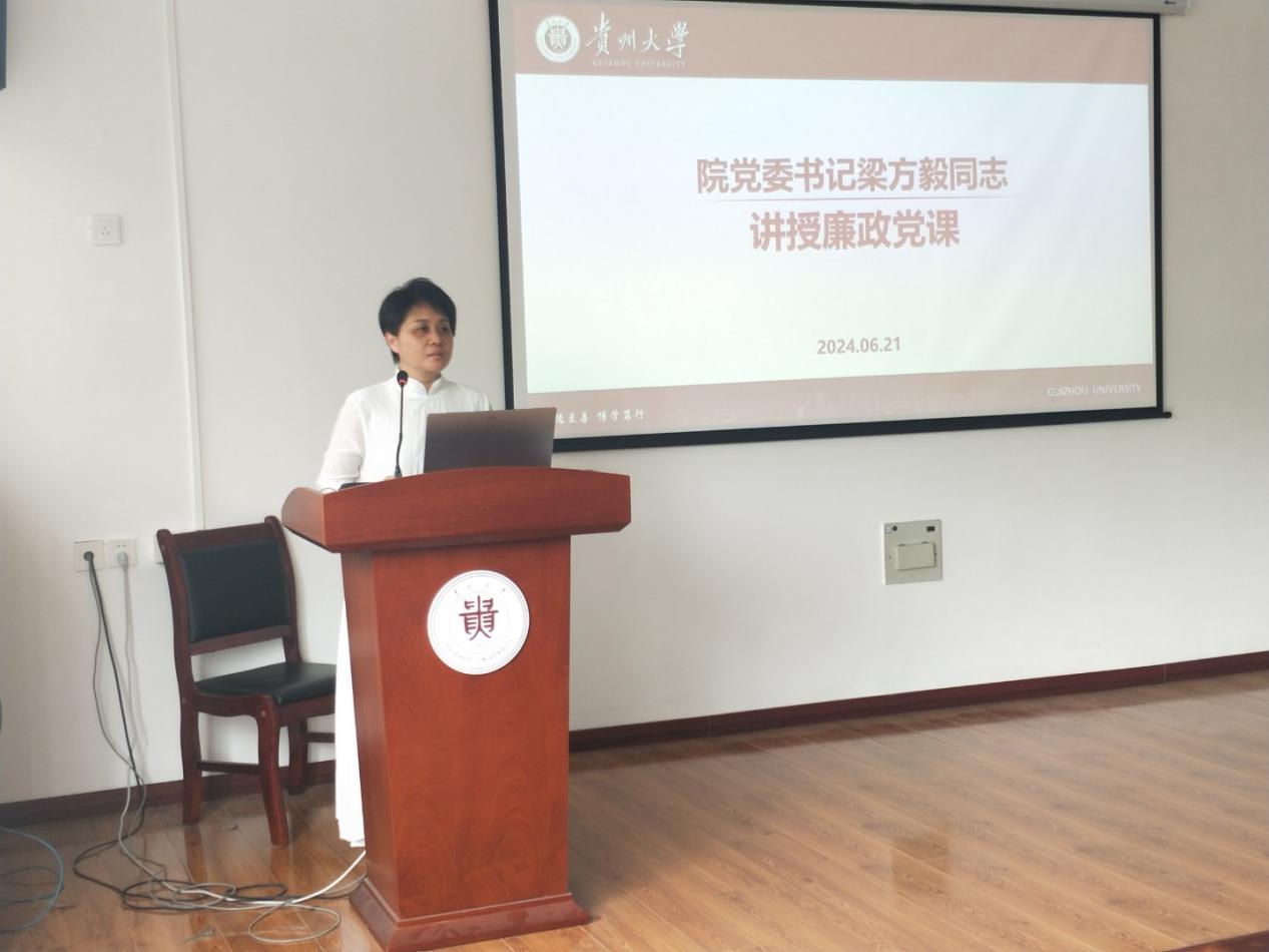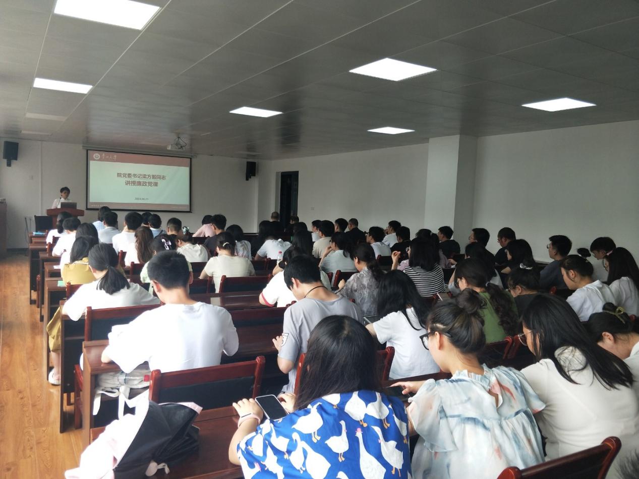 院党委书记梁方毅同志为师生党员上廉政党课。梁方毅摘选了高校教职工违反党的政治纪律、组织纪律、廉洁纪律、群众纪律、工作纪律、生活纪律等六大纪律典型案例,以及违反师德师风典型案例、其他违纪违法典型案例,从案例入手,以案说纪,提醒全院党员要洁身自好,警钟长鸣。